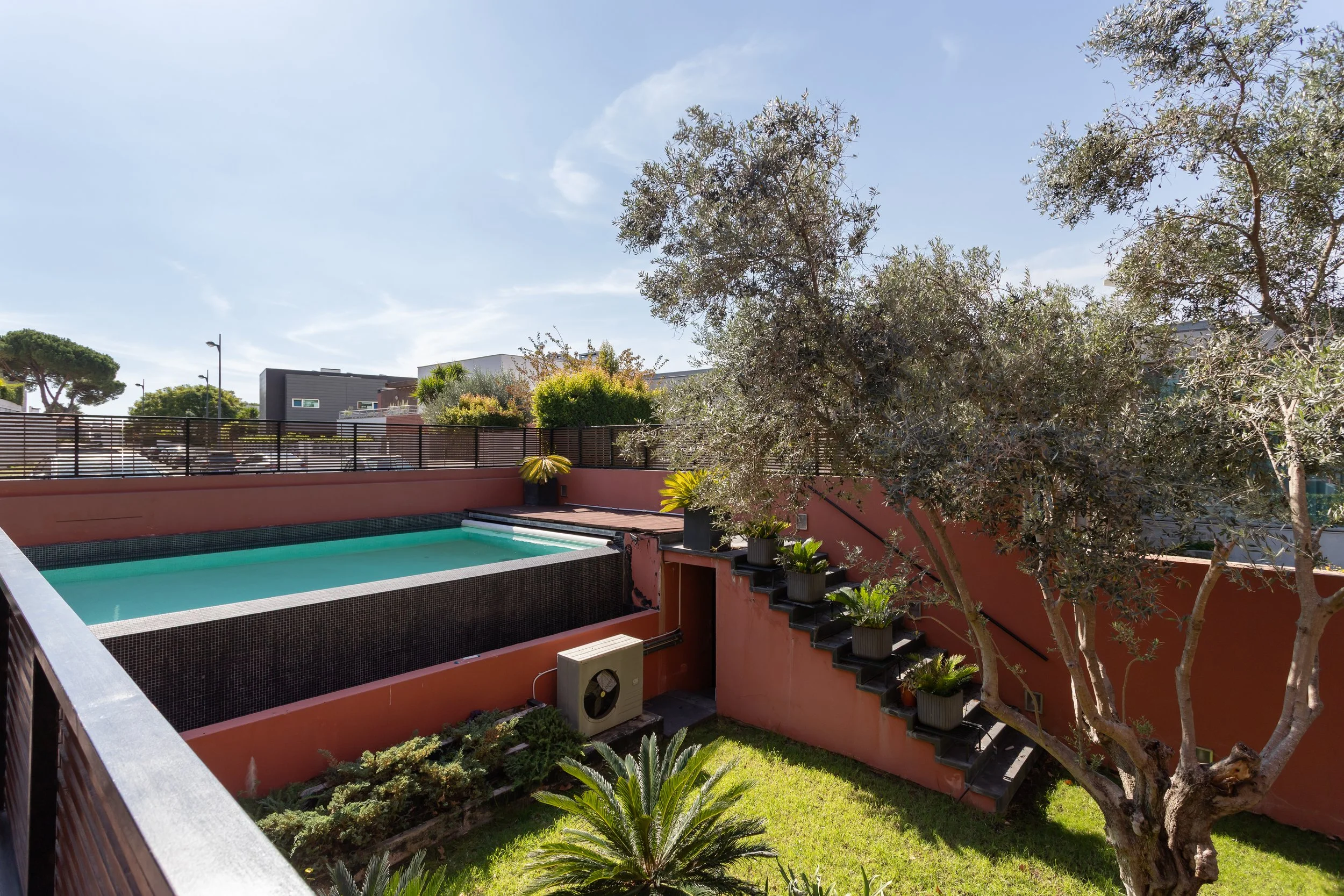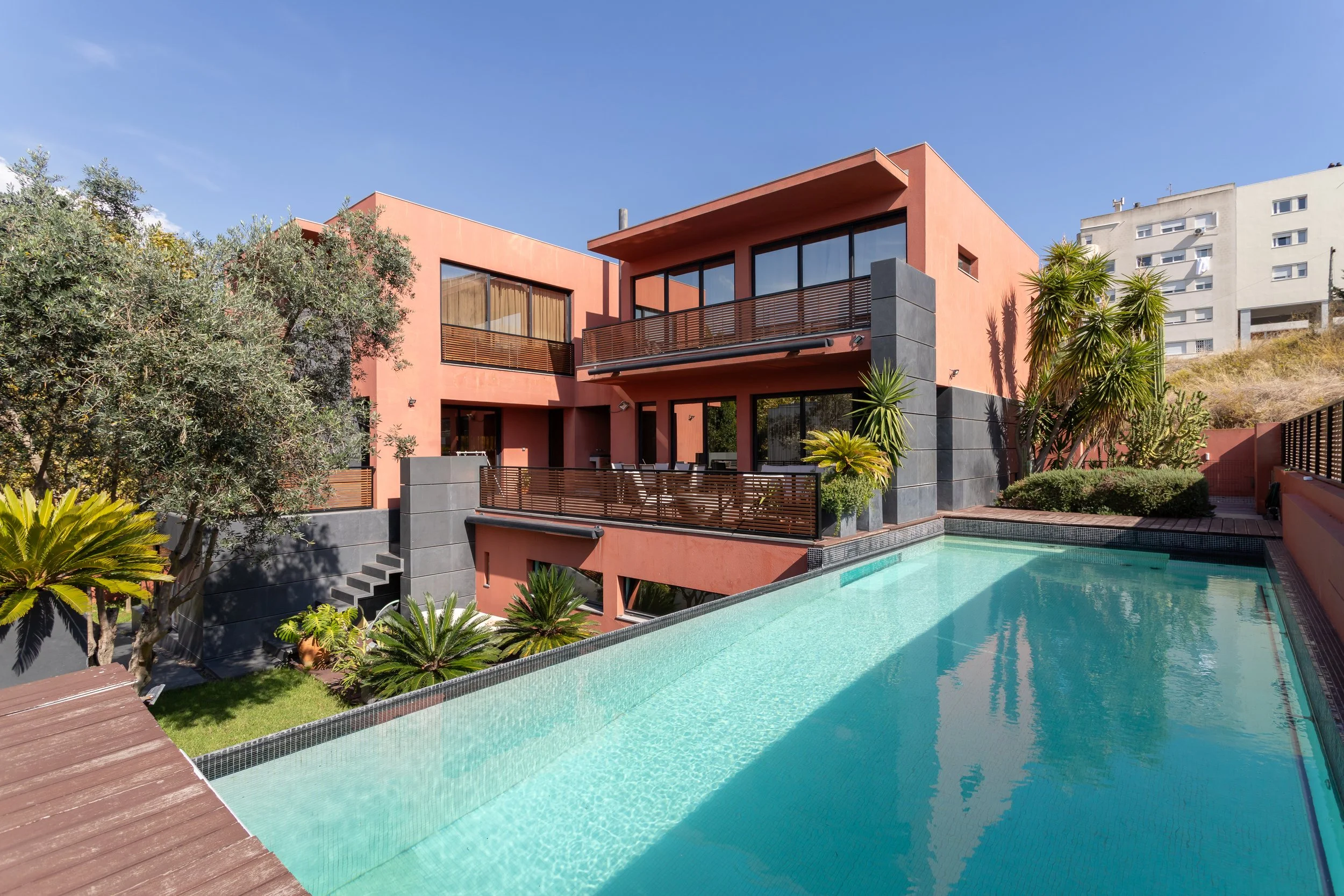 Characterful, modernist family home inside landscaped gardens with a pool and access to multiple terraces and a large garden. Within easy reach of central Lisbon, in the desirable Restelo neighbourhood, this home offers comfort and practicality for an active family.